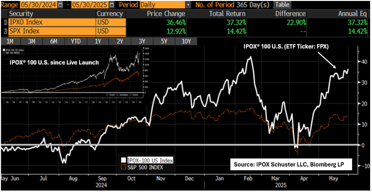 IPOX® WEEKLY REVIEW: The jump in U.S. yields amid global Tariffs and a somewhat cooling U.S. labor market did little to derail the powerful moves in the New Generation of Stocks captured by IPOX® during May with Earnings Momentum overwhelmingly driving trading direction and positioning. Amid the drop in risk (VIX: -24.58%), relative spreads moved aggressively in IPOX®s favor with only a few exceptions.