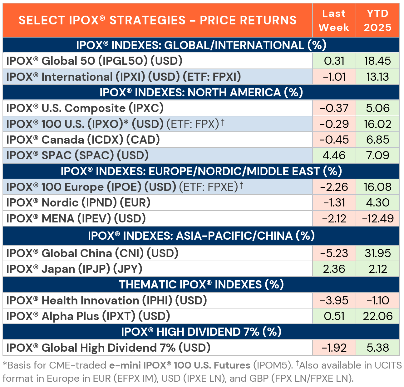 Profit taking and downgrades of some of our key portfolio stocks pressured the IPOX® Global China (CNI) last week, with the portfolio of 50 holdings dropping by -5.23% to +31.95% YTD. Overnight weakness in Chinese stocks followed through to weak European trading with the IPOX® 100 Europe (ETF: FPXE) dropping by -2.26% to +16.08% YTD, now +148 bps. better than when compared to the European market YTD. Select firms recording downside included some of the past week’s big winners, such as H.K.-traded key global Tech-Lifestyle play PopMart International (9992 HK: -12.11%), SK Bio (6990 HK: -7.15%) and Chinese travel site operator Trip.com (TCOM US: -6.89%). European firms trading in Europe or abroad fall as well, including U.S.-traded Dutch biotech IPO NewAmsterdam (NAMS US: -11.13%), Swedish IPO M&As pharma firms H Lundbeck (HLUNDB DC: -5.61%) and Swedish Orphan Biovitrum (SOBI SS: -4.35%) and Belgiums UCB (UCB NA: -3.64%). Across our Continental European exposure, we continue to note the fresh post-IPO high in Swiss IPOX® heavyweight engineering services provider Accelleron Industrie (ACLN SW: +3.19%). Big gains in IPO M&A semiconductor maker Advantest (6857 JP: +15.60%) propelled Japan to a great week, while geopolitics and fears over secondary issuing activity pressured the IPOX® MENA (IPEV) towards a bear market.