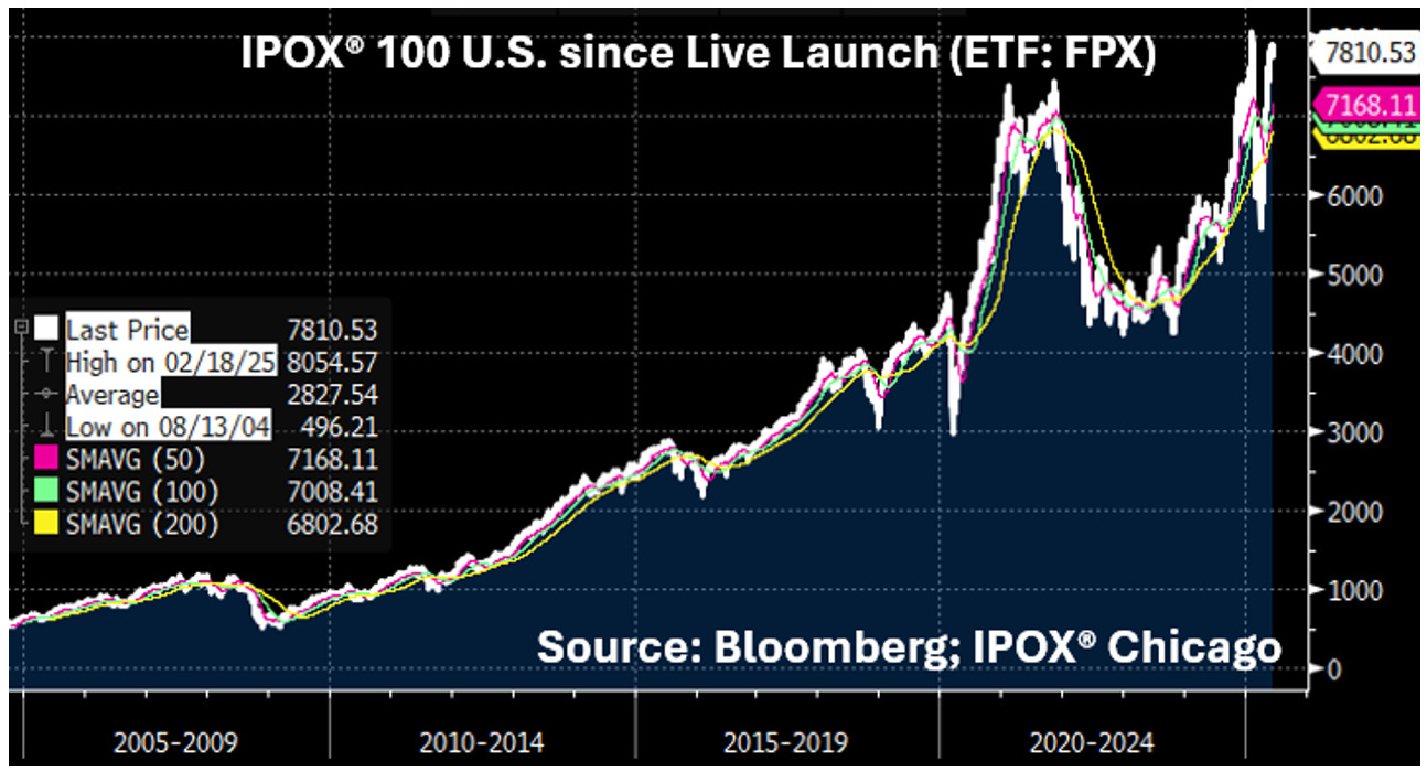 In the United States, the IPOX® 100 U.S. (ETF: FPX) – benchmark for the performance of U.S. IPOs and tracked by $2 billion in AUMs tied to ETFs, SMAs and listed Futures – consolidated for a 2nd week to shed -0.29% to +16.02% YTD, performing broadly in line with the benchmarks. 49% of portfolio holdings rose, with the average (median) equally weighted stock adding +1.00% (-0.03%), better than when compared to the IPOX® 100 U.S. Index (ETF: FPX). Positioning into Friday’s re-balancing, indexes inclusion effects as well as strong Momentum continued to propel AI play recent IPO Coreweave (CRWV US: +24.72%) and wireless telecom play de-SPAC AST SpaceMobile (ASTS US: +19.73%) to fresh post-IPO highs, while some of the heavyweights declined, including AI solutions provider IPO Applovin (APP US: -10.92%). We note more gains for the Climate/ESG tilted version (IPXT) of the IPOX® U.S. Composite (IPXC) which added +0.51% to +22.06% YTD last week.