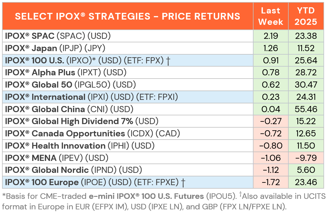 UNITED STATES: The IPOX® 100 U.S. (ETF: FPX) advanced by +0.91% to +25.64% YTD, recovering all but 5 bps. of last week’s relative losses vs. benchmark S&P 500 (SPX). 55% of portfolio stocks rose, with the average (median) firm gaining +0.80% (+0.38%), less than when compared to the applied market-cap weighted IPOX® 100 U.S., underlying for the $1.1 billion “FPX” ETF and CME-listed IPOX® 100 Emini Futures (IPOU5). Some strong gains were recorded by firms challenging respective industry leaders, including cloud storage provider Snowflake (SNOW US: +21.26%), coffee chain Dutch Bros (BROS US: +9.63%) and biotech IPO M&A Bridgebio Pharma (BBIO US: +5.46%). Language app Duolingo (DUOL US: -10.25%) ranked as the weakest holding as internet behemoth Google rolled out its version of a language learning tool, while Chicago-based insurer Ryan Specialty (RYAN US: -4.25%) closed out the trading week at a fresh 52-week low. We note the continued strength in the 50-member strong and highly liquid IPOX® SPAC (SPAC) which tracks many of the most innovative de-SPACs sourced by IPOX®.