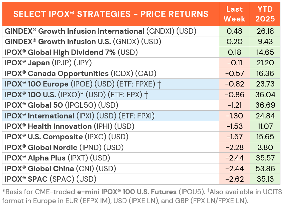 SUMMARY: The IPOX® Indexes consolidated across the Indexes Universe post-Futures & Options expiration week, driven by profit-taking across high-beta stocks after the big run-up. Amid stable rates, our portfolios focusing on 7% High Dividend stocks as well as Domestic (GNDX) and International (GNDXI) acquirers of IPOs gained. IPO-related Corporate Actions (“IPO M&A”) continued with the acquisition of biotech 01/25 IPO biotech Metsera (MTSR) which was added to the IPOX® 100 U.S. (ETF: FPX) the previous Friday and was taken over by large-pharma Pfizer (PFE) by Monday.