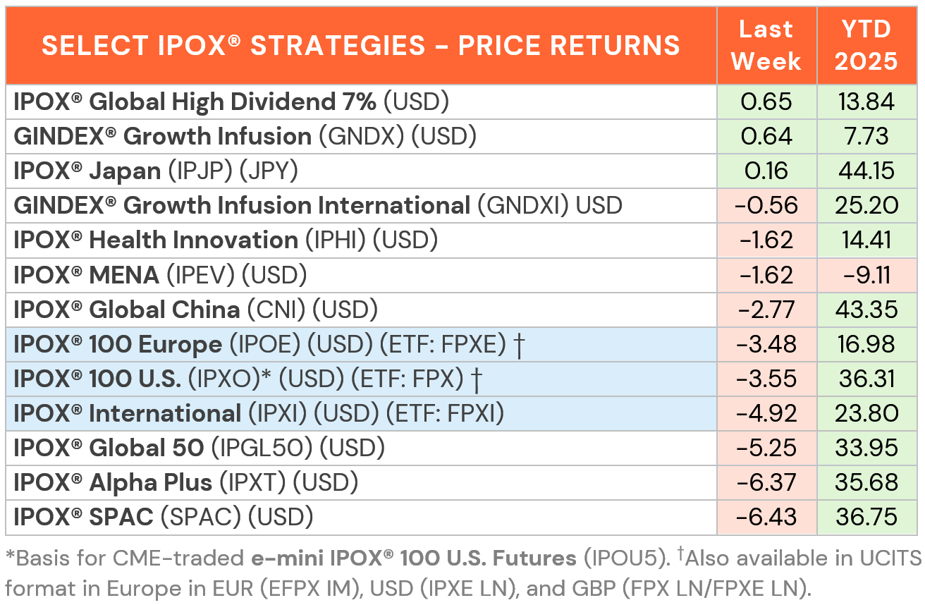 INTERNATIONAL: Outside the U.S., the story of the week belonged to the strength in the IPOX® Japan (JPJP), our bespoke solution for investors in Japanese growth stocks. On the back of big gains in 12/24 memory chip maker IPO Kioxia (285A JP: +11.22%) and IPO M&A drug maker Sumitomo Pharma (4506 JP: +27.16%), the portfolio rose by +0.16% to +44.15% YTD, staying massively ahead of the strong Japanese benchmarks (see Chart below). The earnings-driven decline in 10/22 IPO SoC maker Socionext (6526 JP: -31.95%) weighed.