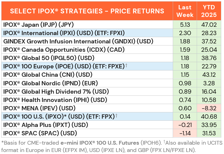 JAPANESE STOCKS DRIVE IPOX® INTERNATIONAL ETF (FPXI): Non-U.S. domiciled IPOX® equity exposure outperformed during quiet holiday trading as U.S. rates traded range-bound, the EUR strengthened and equity risk (VIX: -8.80%) fell anew. For example, the IPOX® International ETF (FPXI) – benchmark for the performance of 50 large and highly liquid non-U.S. domiciled New Listings sourced by IPOX® - added +2.30% to +28.23% YTD last week, +104 bps. ahead of a respective benchmark from index provider MSCI. Driver of the big strength was the portion of the portfolio allocated to Japan-domiciled firms, as the government reiterated its unwavering commitment to support homegrown AI- and technology industries. Respective exposure propelled the IPOX® Japan (IPJP) by a massive +5.13% to +47.02% last week, driven by semiconductor maker Kokusai Electric (6525 JP: +24.95%; 10/23 IPO) and memory chip specialist Kioxia (285A: +22.22%; 10/24 IPO), with portfolio heavyweight and IPO M&A chip testing machines maker Advantest (6857 JP: +5.47%) also rising strongly. Renewed gains in specialty stocks linked to mining and to the consumer also supported, such as South African Spin-off Valterra Platinum (VALT LN: +5.84%) and Canada IPO Star, online retailer Groupe Dynamite (GRGD CN: +6.67%), both closing out the week at fresh-post IPO/Spin-off High. UK-based semi-conductor maker ARM (ARM US: -3.30%) weakened further.