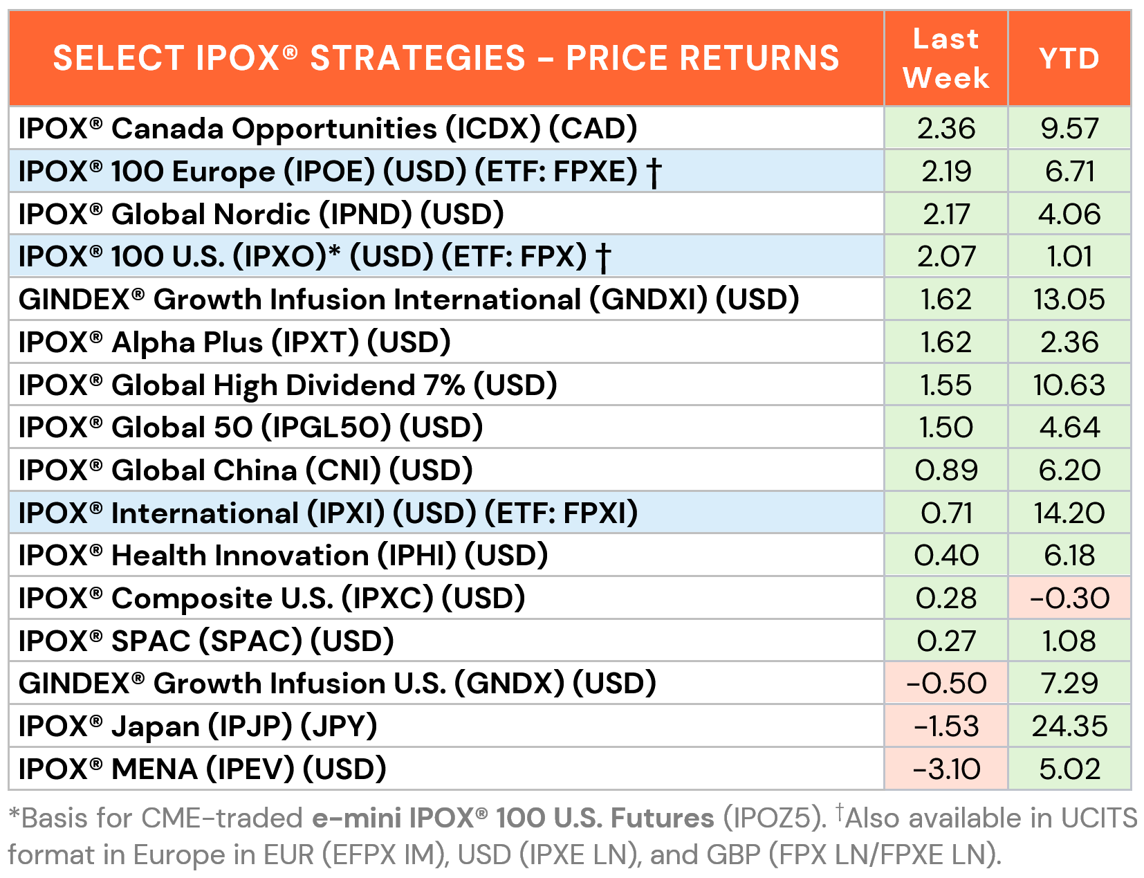 INTERNATIONAL: Earnings-driven strength extended to most IPOX® Markets outside the US. Top of the list ranked the IPOX® Canada (ICDX) which soared to +9.57% YTD, now +293 bps. ahead of the hard-to-beat Canadian market. While the IPOX® Japan (IPJP) fell on profit-taking towards the weekend and Chinese markets were mostly closed, the IPOX® 100 Europe (ETF: FPXE) continued its march into uncharted territory to record a fresh lifetime High. This helped to add another strong week to the IPOX® International (ETF: FPXI), adding +0.71% to +14.20% YTD, +595 bps. ahead of its benchmark. Firms making notable moves included Canadian online shopping portal Groupe Dynamite GRGD CT: +13.96%), Norway’s high-yielding oilfield services provider DOF Group (DOFG NO: +11.06%) and Czech defense play CSG (NSG NA: +10.01%). One of last year’s most press-heavy IPOs, London-based Fintech Klarna (KLAR US: -27.77%), plunged anew amid the ongoing multiples contraction following a mixed Q4/2025 earnings report.