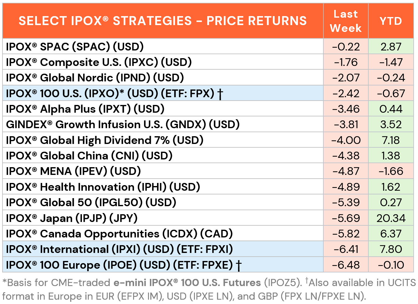 INTERNATIONAL: Respective IPOX® Indexes focused on non-US exposure performed in line to better than when compared to the respective benchmarks last week. In Europe, e.g., a big week for Italy’s lottery operator Lottomatica (LTMC IM: +21.32%), French biotech Nanobiotix (NANO FP: +11.05%), Norway’s Var Energy (VAR NO: +8.99%) and Swiss dermatology products-focused Galderma (GALD SE: +6.92%) helped the IPOX® 100 Europe (ETF: FPXE) to tie the YTD return of the European Market, while the IPOX® Japan (IPJP) and IPOX® Canada (ICDX) fell to +20.34% YTD and +6.37% YTD, respectively. In China-linked IPOX® exposure, the IPOX® Global China (CNI) continued to lead the list of Chinese growth stock portfolios, declining to +1.38% YTD last week. The 50-member strong index of a diversified group of highly liquid New Listings and respective China-linked IPO M&A extended its YTD lead vs. the CSI Overseas China Internet Index (H11137), tracked by the KWEB ETF, to a large +1338 bps. YTD. Positive outlier here included best-in-class global battery maker Contemporary Amperex Technology (3750 HK: +3.43%). Amid the turmoil in the region, the IPOX® MENA (IPEV) continued its sharp pullback for a 2nd week in a row, declining to -1.66% YTD. With the derivative-heavy benchmarks finishing sharply lower, the IPOX® International (ETF: FPXI) remained a large +516 bps. YTD (+1060 bps. Y/Y) ahead of the International Market.