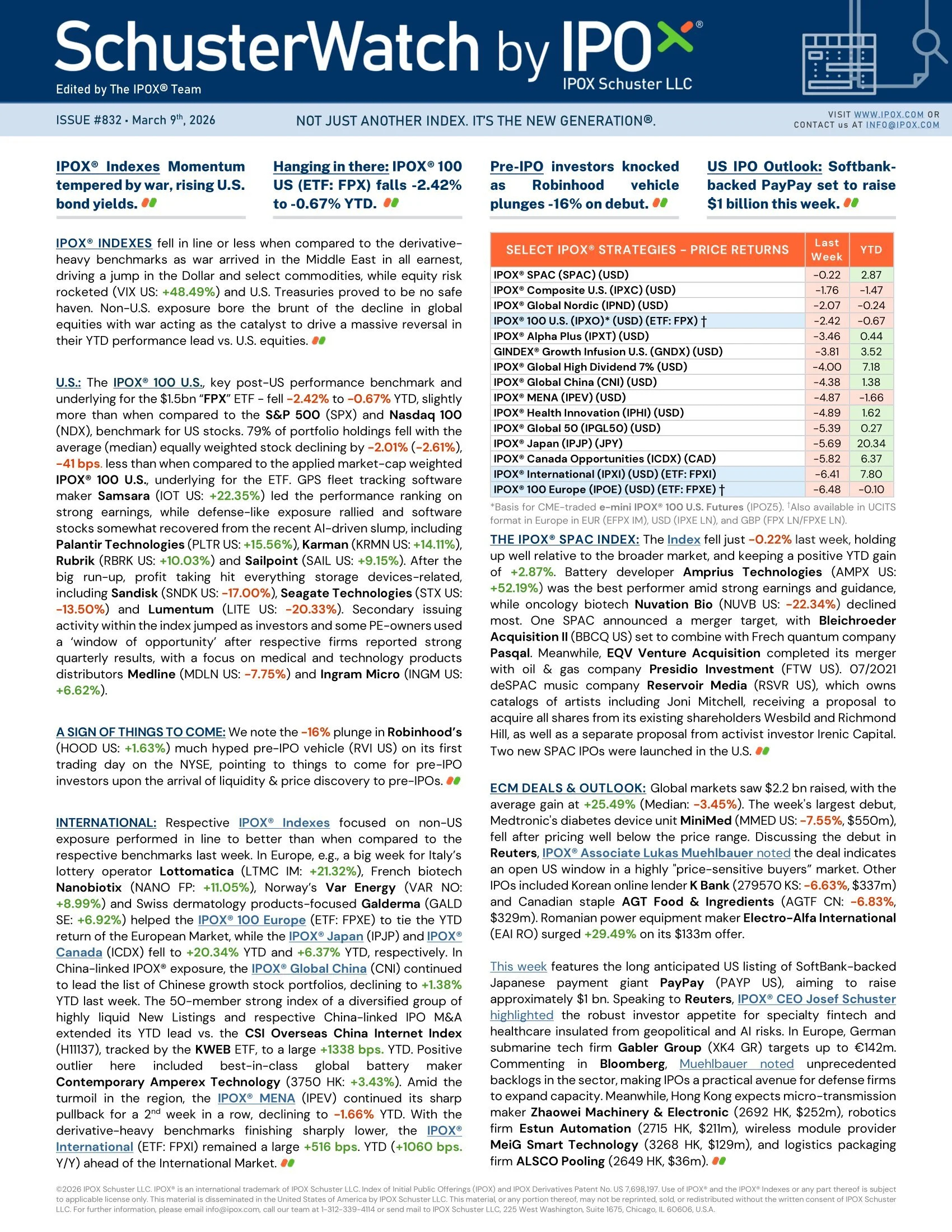 IPOX® Indexes Momentum tempered by war, rising U.S. bond yields.