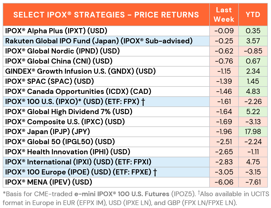 INTERNATIONAL: Respective other IPOX® Indexes focused on non-US exposure fell on risk shifting on profit taking across sectors, including alternative energy and mining. To no surprise, the IPOX® MENA (IPEV) was hit particularly hard, plunging by -6.06% to -7.61% amid the retreat or foreign investors from the region, with fertilizer maker Fertiglobe (FERTIGLB UH: +2.08%) being a notable exception.