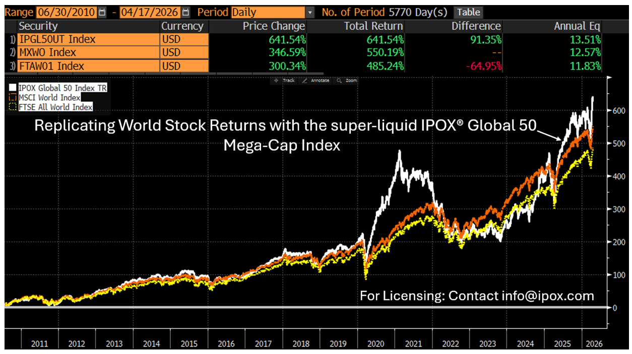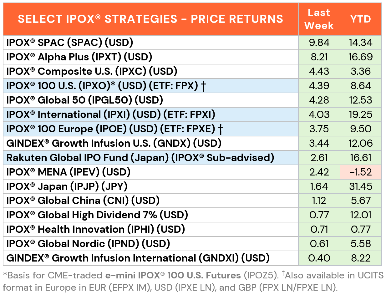 GLOBAL/INTERNATIONAL/EUROPE: Select IPOX® Strategies closed out the trading week at or near All-Time Highs as well. Top of the list ranked the super-liquid IPOX® Global 50 (IPGL50: +4.28%) benefiting from another big week for the IPOX® International (ETF: FPXI). Strong gains in European stocks exclusively listed in the U.S. drove the IPOX® 100 Europe (IPOE) to extend its YTD lead vs. the hard-to-beat STOXX 50 (SX5L) to ca. +400 bps. to close out the week at the highest level on record. Across APAC, the IPOX® Global China (CNI: +1.12%) lagged, while IPOX® Japan (IPJP: +1.64%) set a fresh record and the IPOX® MENA (IPEV) recovered more of its YTD losses.
