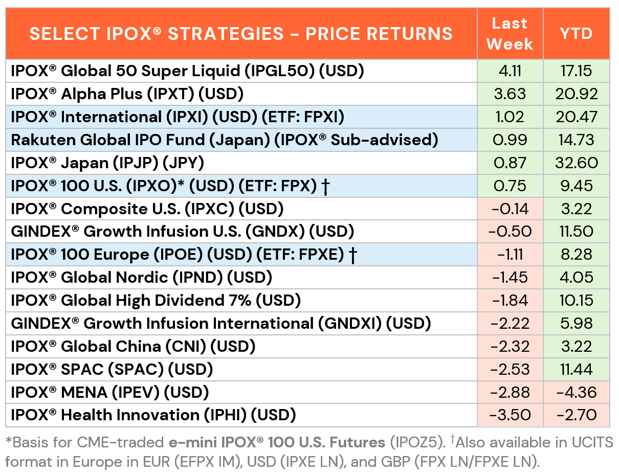 INTERNATIONAL/GLOBAL: Similar to the U.S., Markets, abroad traded highly uneven last week. While the IPOX® Global China (CNI: -2.32%) and IPOX® MENA (IPEV: -2.22%) fell, an overweight to AI and select specialty stocks related to defense and personal healthcare benefited select IPOX® Strategies. Here, big relative strength in the IPOX® 100 Europe (IPOE: -1.11%, ETF: FPXE) and IPOX® Japan (IPJP: +0.87%) drove the IPOX® International (IPXI: +1.02%) and IPOX® Global 50 Super Liquid (IPGL50: +4.11%) significantly higher. Amid the global frenzy into semiconductor stocks, Britain-based ARM (ARM US: +40.83%), Koreas top defense play HD Hyundai Heavy Industries (329180 KS: +30.54%), Japan’s buoyed memory chip maker Kioxia (285A: +13.27%), Germany’s Siemens Energy (ENR GY: +9.04%) and Koreas personal care firm APR (278470 KS: +7.27%) led the way. In what was a big rotation trade out of miners and health care/biotech last week, Valterra Platinum (VALT LN: -15.71%), Canada’s DP Metals (-8.64%), Hong Kong-listed Sichuan Kelun-Biotech Biopharma (6990 HK: -8.12%) and Canada’s Triple Flag Precious Metals (TFPM US: -7.15%) ranked towards the bottom of last week’s IPOX® Performance Ranking.