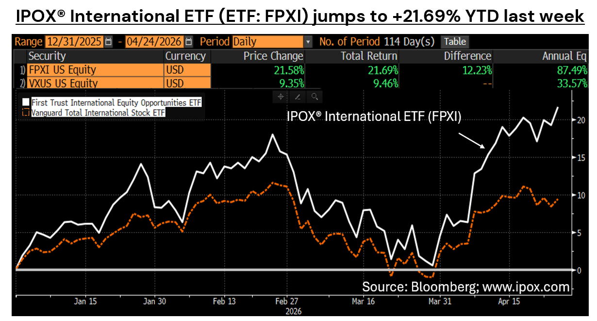 +371 bps. Weekly Beat: IPOX® International (ETF: FPXI) soars to 21% YTD.