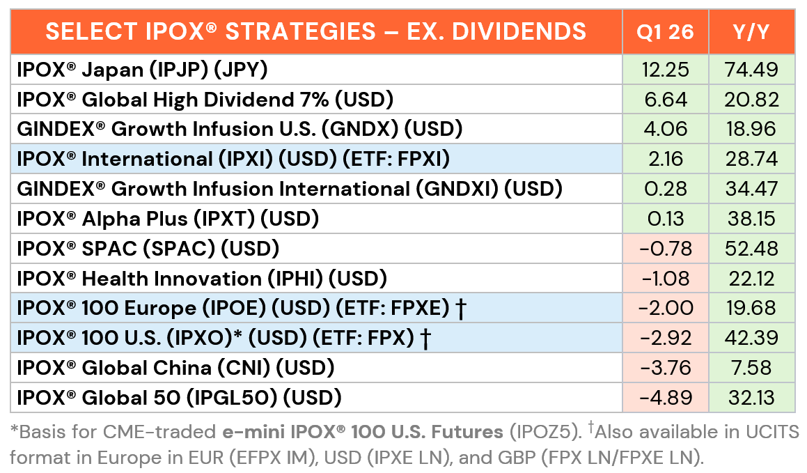 IPOX® Japan, IPOX® Global High Dividend 7% lead Q1 performance rankings.