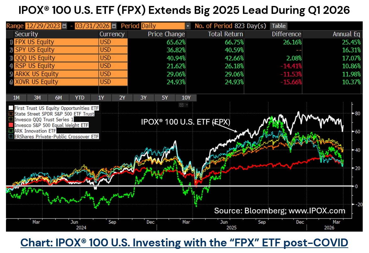 UNITED STATES: The IPOX® 100 U.S., key semi-passive U.S. post-IPO performance benchmark and underlying for the $1.5bn “FPX” ETF – declined -2.92% during Q1 2026, +171 bps. and +306 bps. better than when compared to passive U.S. stock benchmarks S&P 500 (SPX) and Nasdaq 100 (NDX), while also outperforming a long list of active ETFs with a high New Listings Factor load, including the ARK Innovation Fund (ARKK: -12.13%). Big losses in SaaS, Crypto and select Financials such as in Sailpoint (SAIL US: -34.55%), SoFi (SOFI US: -39.34%), LegalZoom (LZ US: -42.90%) and Unity Software (U US: -50.33%) were almost offset by big gains in computer storage device makers Sandisk (SNDK US: +167.55%), Lumentum (LITE US: +90.66%), biotech CG Oncology (CGON US: +63.01%) and energy firms Kodiak Gas Services (KGS US: +57.47%) and Knife River (KNF US: +16.06%).