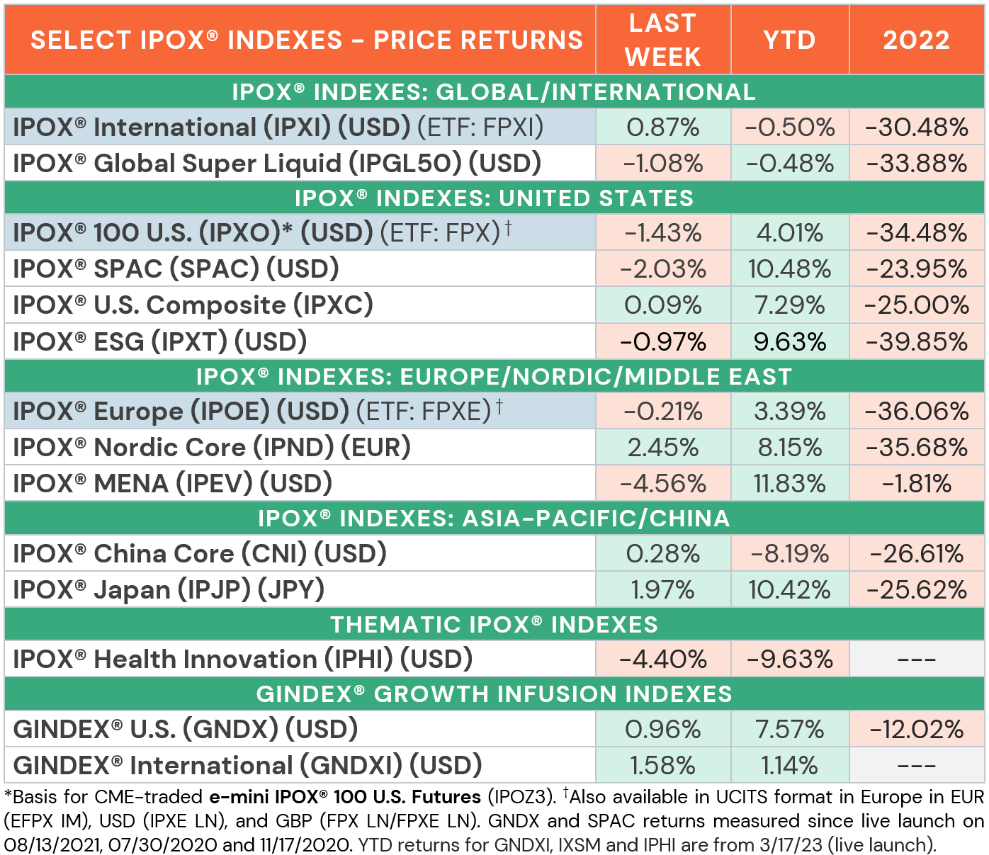 IPOX® PERFORMANCE REVIEW: Amid heightened geopolitical tensions due to the Israel-Hamas conflict, the IPOX® Indexes saw varied performances across global markets. In the U.S., earnings season kicked off with Q3 reports from major banks such as JPMorgan Chase and Wells Fargo, offering a positive note on Friday, while inflation expectations hit a five-month peak with the WTI crude oil price climbing to $87. Meanwhile, risk-averse investors sent yields lower across the board, seeking stability in traditional safe-haven assets such as Gold and U.S. treasury bonds, moving away from small caps, e.g., Russell 2000 (RTY: -1.48%), and unseasoned growth stocks. This led the IPOX® 100 U.S. (ETF: FPX) lower by -1.43% to +4.01% YTD. Globally, the IPOX® MENA (IPEV) declined -4.56% amid the conflict in the Middle East, as analysts warned of soaring oil prices and a dip in global growth if the conflict expands to involve Iran. Still, Citibank maintains an optimistic outlook for the region’s IPO market, which saw Saudi Arabia’s largest YTD listing last week. The IPOX® International (ETF: FPXI) secured gains, adding +0.87% to -0.50% YTD, while in Europe, the IPOX® Europe (ETF: FPXE) experienced a minor decline of -0.21% to +3.39% YTD. The IPOX® Nordic (IPND) continued its momentum to a new 12-month high, climbing +2.45% to +8.15% YTD.